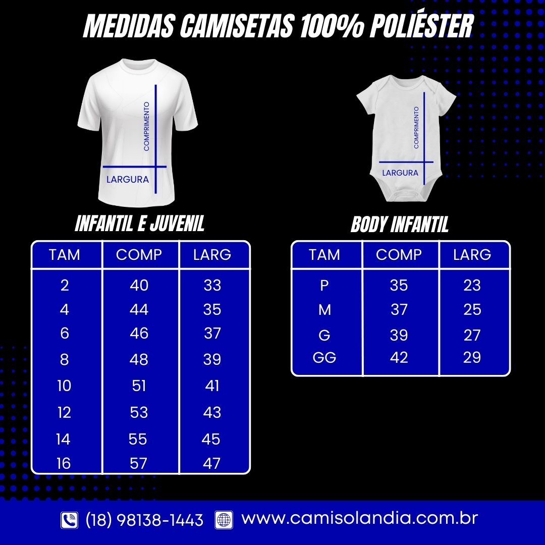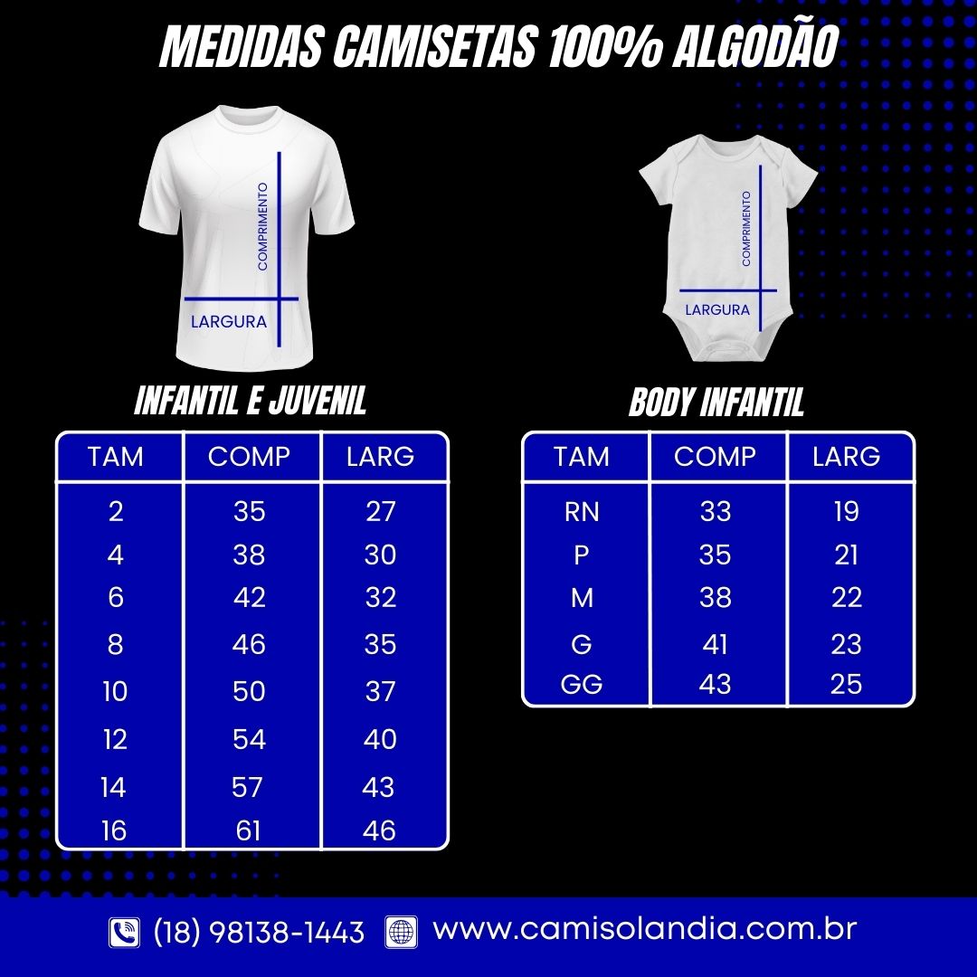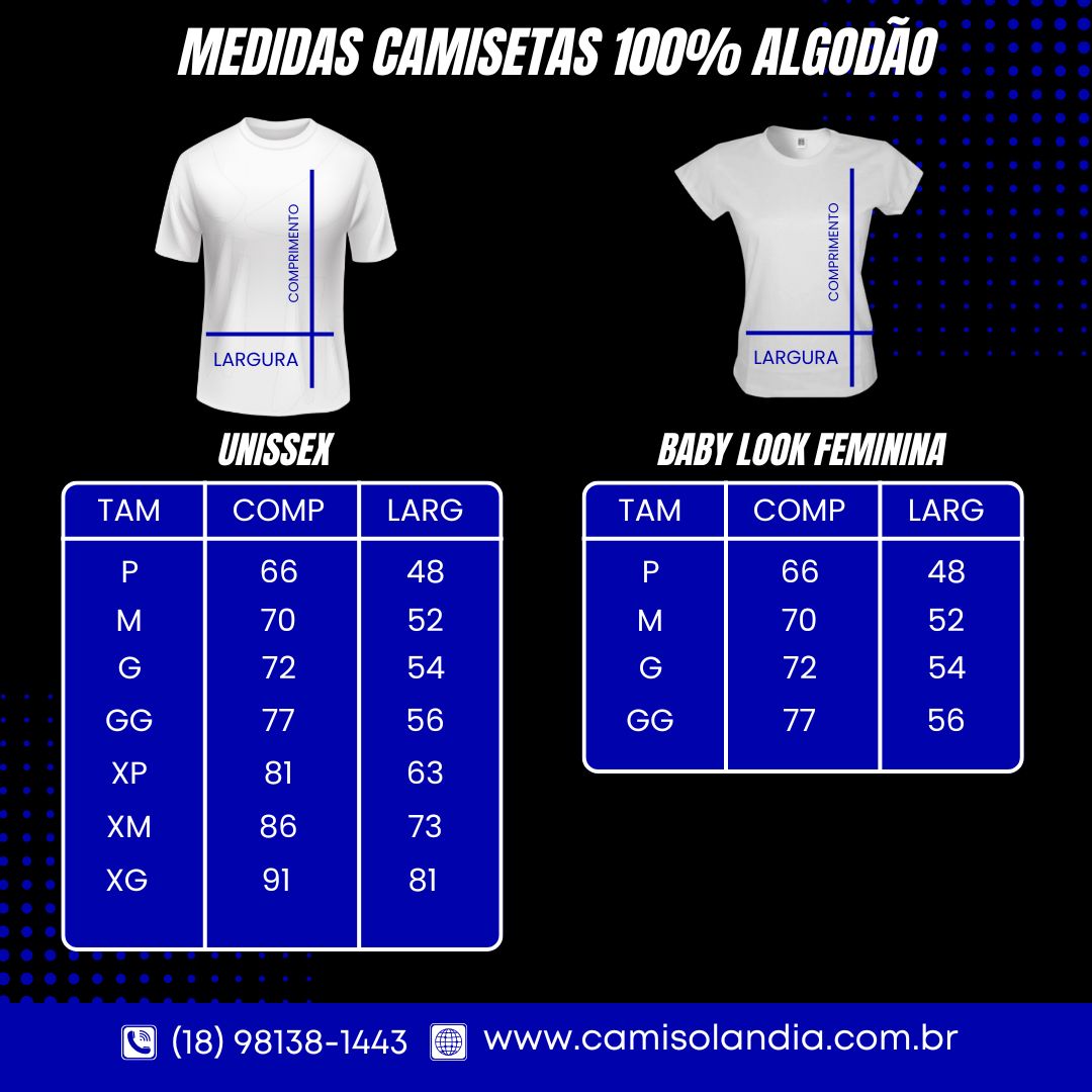 As medidas das camisetas podem variar em até 1,5cm para mais ou para menos devido a costura. Em caso de dúvidas quanto ao tamanho entre em contato através dos nosso canais de atendimento.